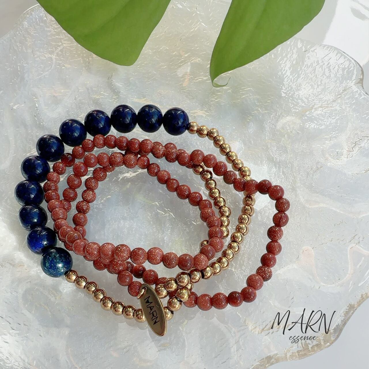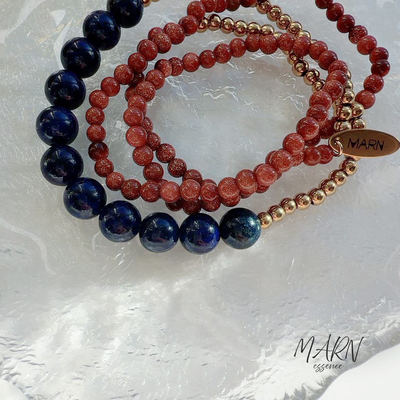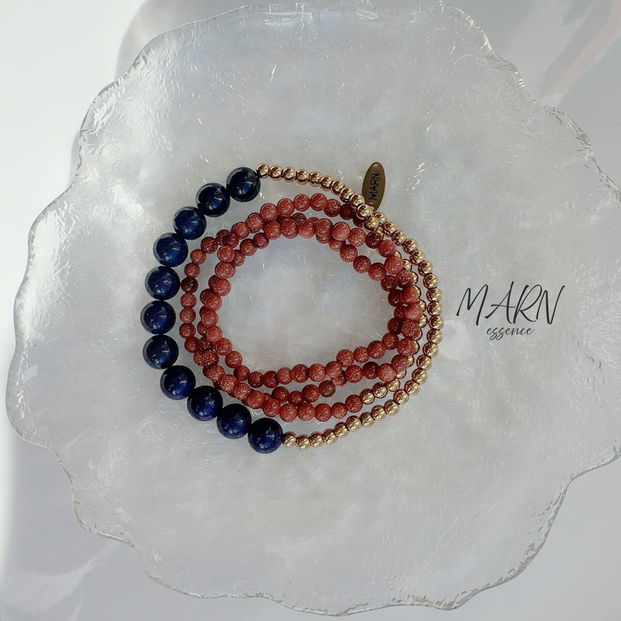 深い群青のラピスラズリと、星屑のようにきらめくゴールドサンドストーンを重ねた、4連ブレスレットです。